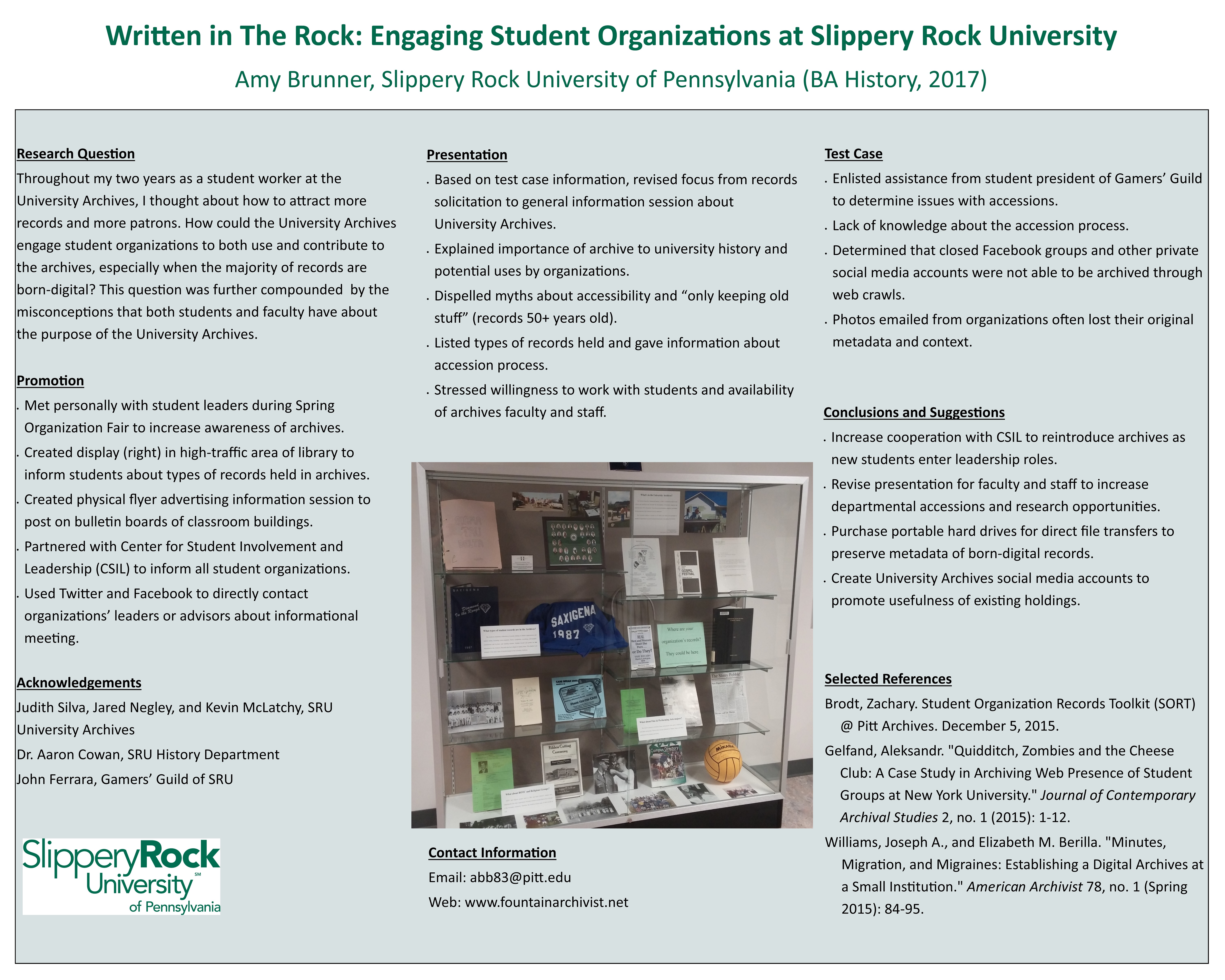 | dc.description.abstract | The University Archives at Slippery Rock University of Pennsylvania documents the university's functions and activities over time. Because the Archives depends on organizations and departments to deposit their materials, the Student Organizations record group contained several noticeable gaps in activity. This poster summarizes efforts to create awareness of the University Archives among student organizations and solicit deposits for research use. | en_US |