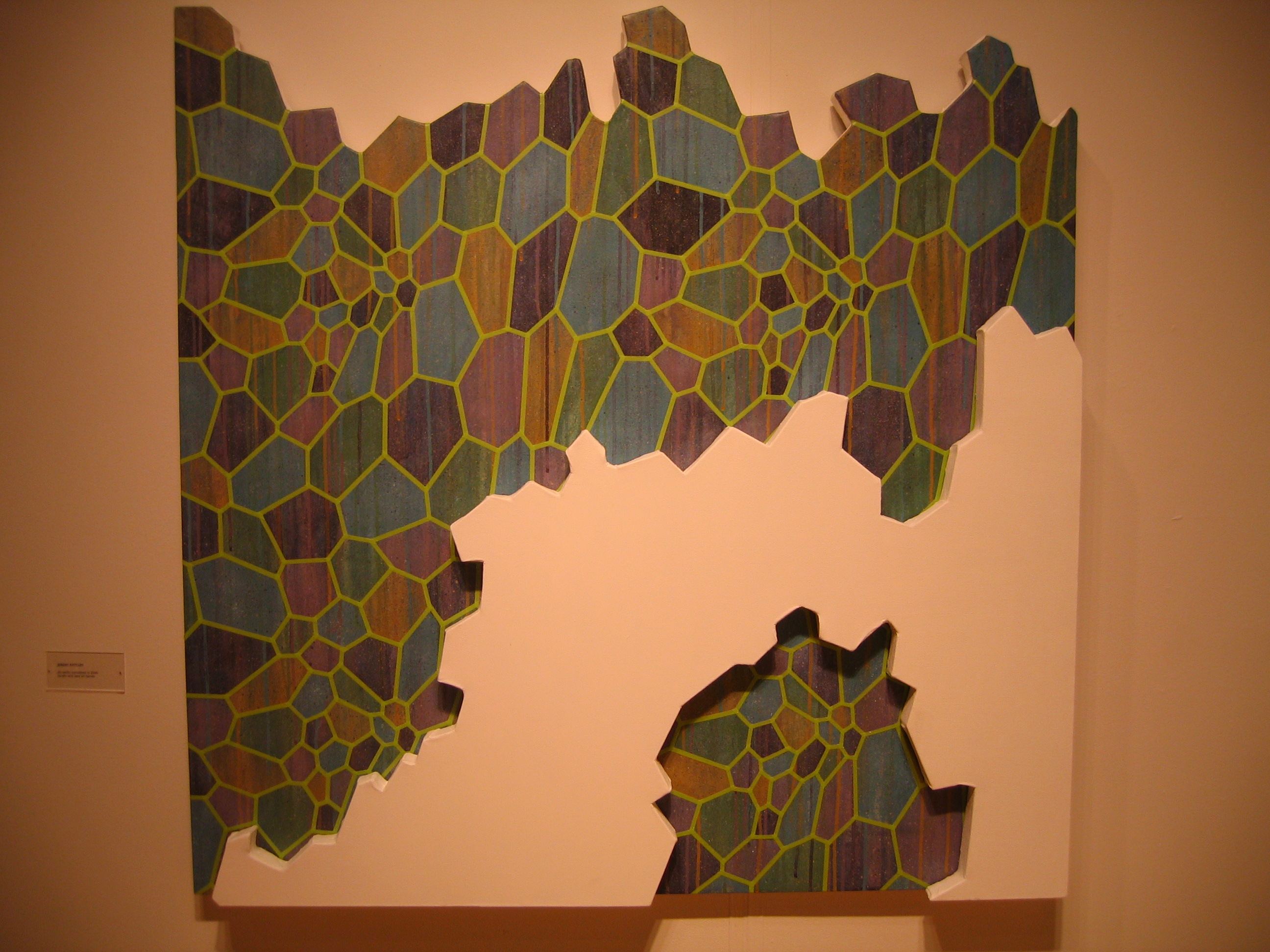 Recent works have presented personal observations of the world's inner-functionality, as connections between my experiences which existentially have little relationship or concern for one another. By breaking down the world into smaller, manageable pieces, the world becomes empirical and credence is given to every basic form. These formulaic, analytical observations have built up a language that mimics structure and pattern. While these works visually have a plethora of poststructuralist appropriations from geometric abstraction, lozenge camouflage, other works by artists, crystalline form, and cartography, it is impossible to dismiss any one reference conceptually. What results from the entanglement between conceptual and visual is a calculated disorder, a seemingly recognizable structure with an inherent chaos disrupting the comprehension.