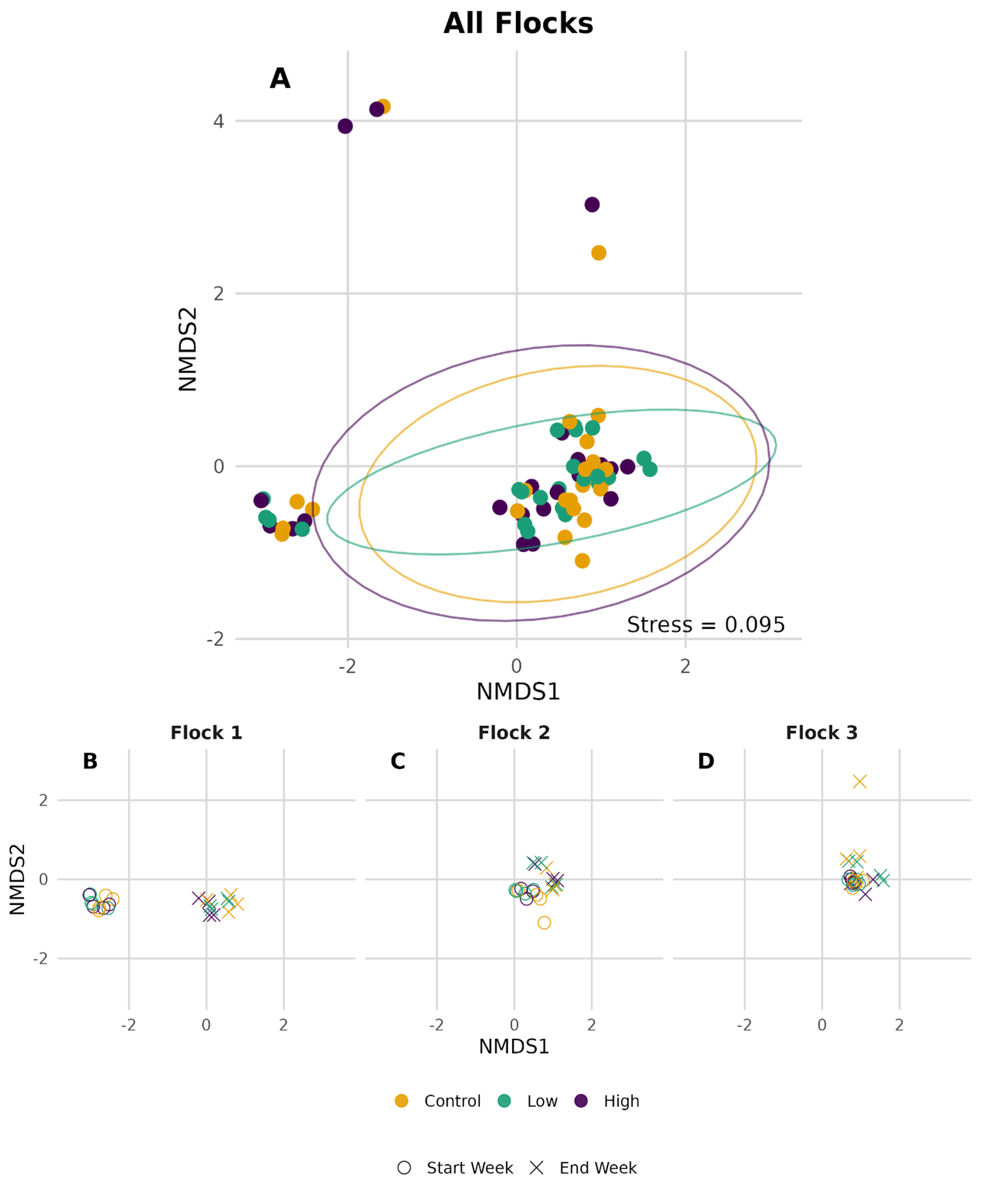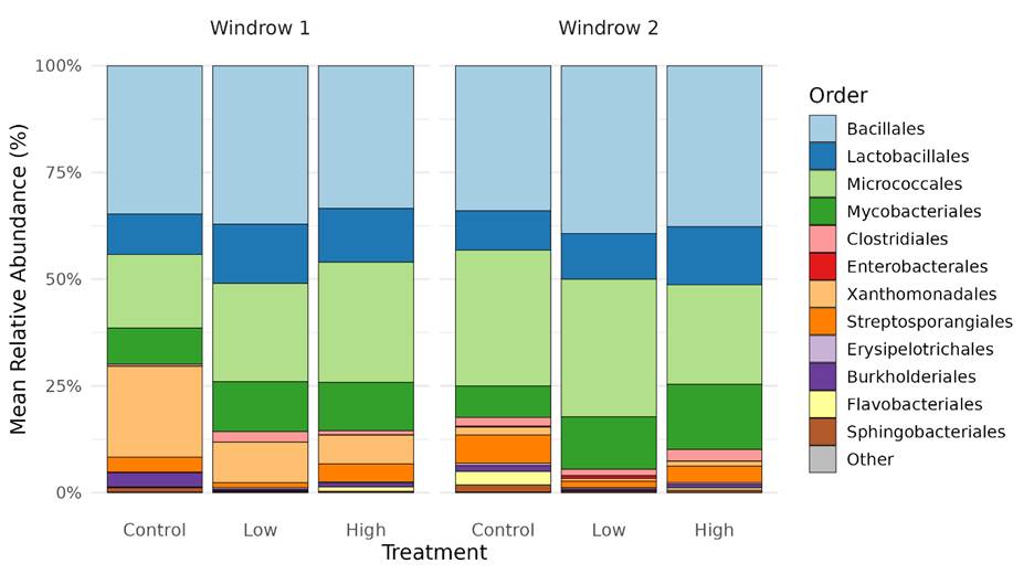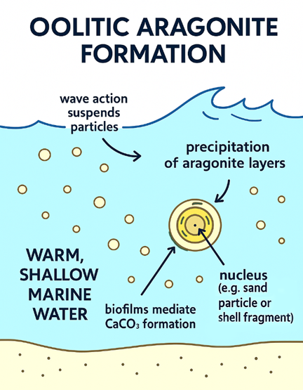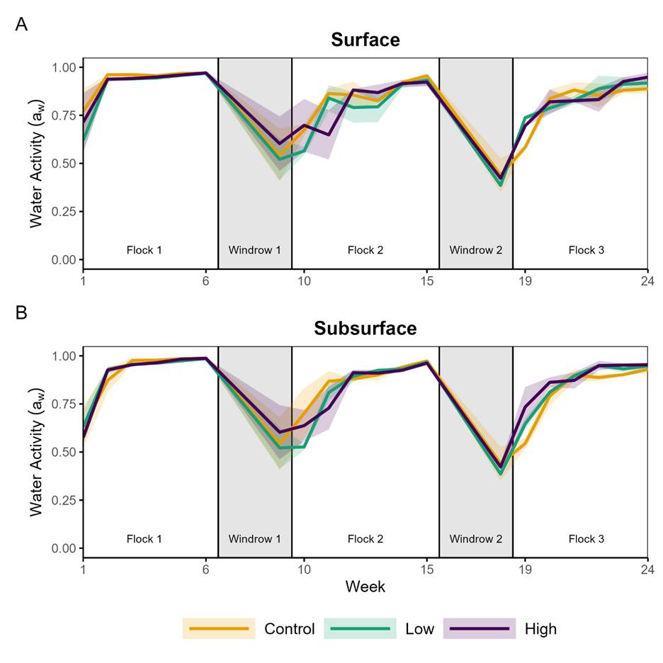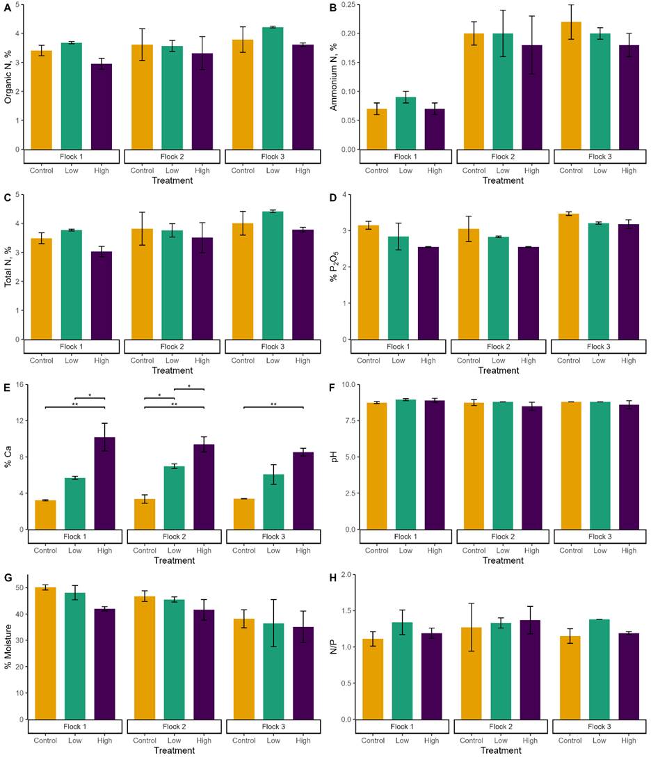 Ammonia (NH3) emissions from broiler production raise environmental, agronomic, and animal welfare concerns. This study evaluated oolitic aragonite (OA), a calcium carbonate-rich Bahamian sand, as a broiler litter amendment to reduce NH3 emissions, improve nitrogen retention, and shape microbial communities. Three consecutive 6-week broiler flocks were raised in environmentally controlled chambers with litter prepared from wood shavings and OA sand at 100:0, 80:20, and 60:40 (shavings:OA) weight ratios. Chamber environmental conditions were continuously monitored, and weekly composite litter samples were analyzed for pH, uric acid, moisture, and water activity. At the end of each flock, litter was tested for total nitrogen, ammonia-N, ammonium-N, and total phosphorus (as P2O5). Despite initial hypotheses that OA would regulate NH3 volatilization through reducing water activity and promoting nitrifying/denitrifying pathways, no significant differences were observed between OA and control litter in NH3 emissions, total nitrogen, uric acid, or water activity. The NH3 flux rose during flock cycles and peaked after windrow composting across all treatments. Microbial community analysis (16S rRNA sequencing) of start and end samples from each flock showed alpha and beta diversity were driven mainly by temporal succession, with shifts from gut-associated taxa (e.g., Enterococcus, Escherichia/Shigella, Clostridium_sensu_stricto) to litter-adapted genera (e.g., Corynebacterium, Brachybacterium, Salinicoccus). While differential abundance testing found few consistent treatment effects, Lysobacter, a genus associated with antimicrobial activity, was persistently enriched in OA treated litter. Observed effects on microbial diversity were subtle and did not result in meaningful functional shifts in the broader community composition between treatments. While OA as a standalone amendment did not significantly affect NH₃ emissions, its selective enrichment of Lysobacter warrants further investigation.