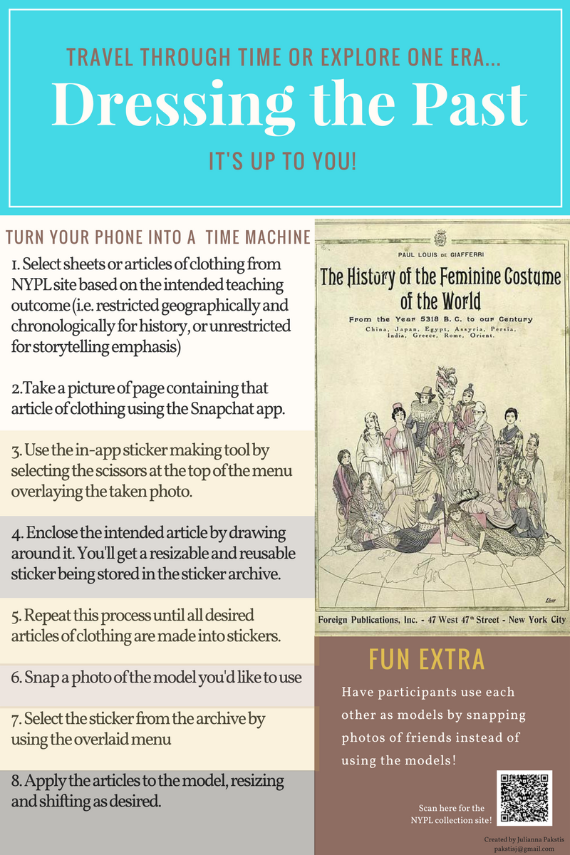 | dc.description.abstract | Dressing the Past is an activity protocol that uses the sticker function on the commonly available Snapchat app to integrate the New York Public Library's The History of the Feminine Costume, From the Year 5318 B.C. to Our Century Collection into historical fact finding or storytelling sessions at libraries across the country. The project aims to introduce technology and creative/critical thinking to the traditional paper doll model. The activity is focused primarily but not exclusively on children ages 6-12, a non-traditional target audience for archival materials. | en_US |