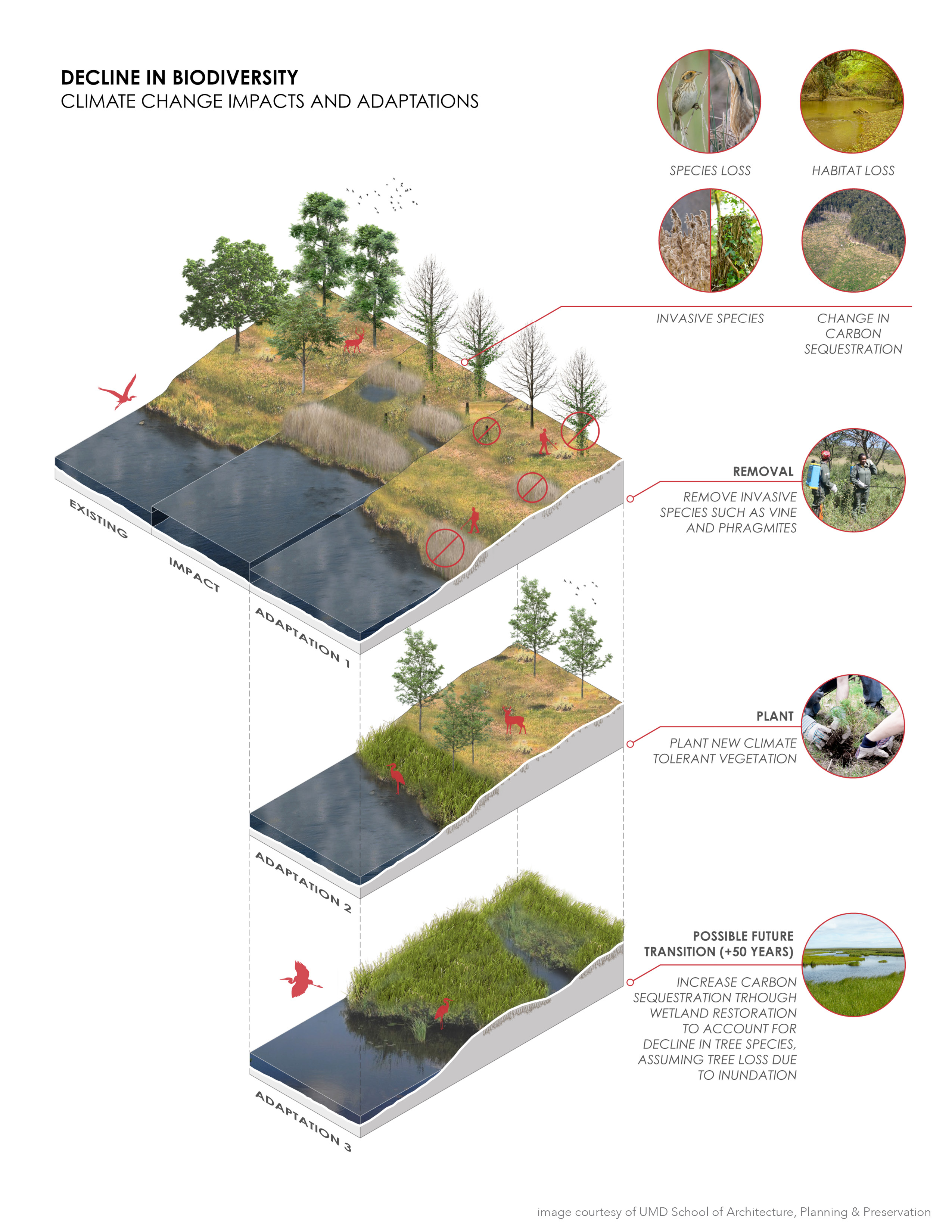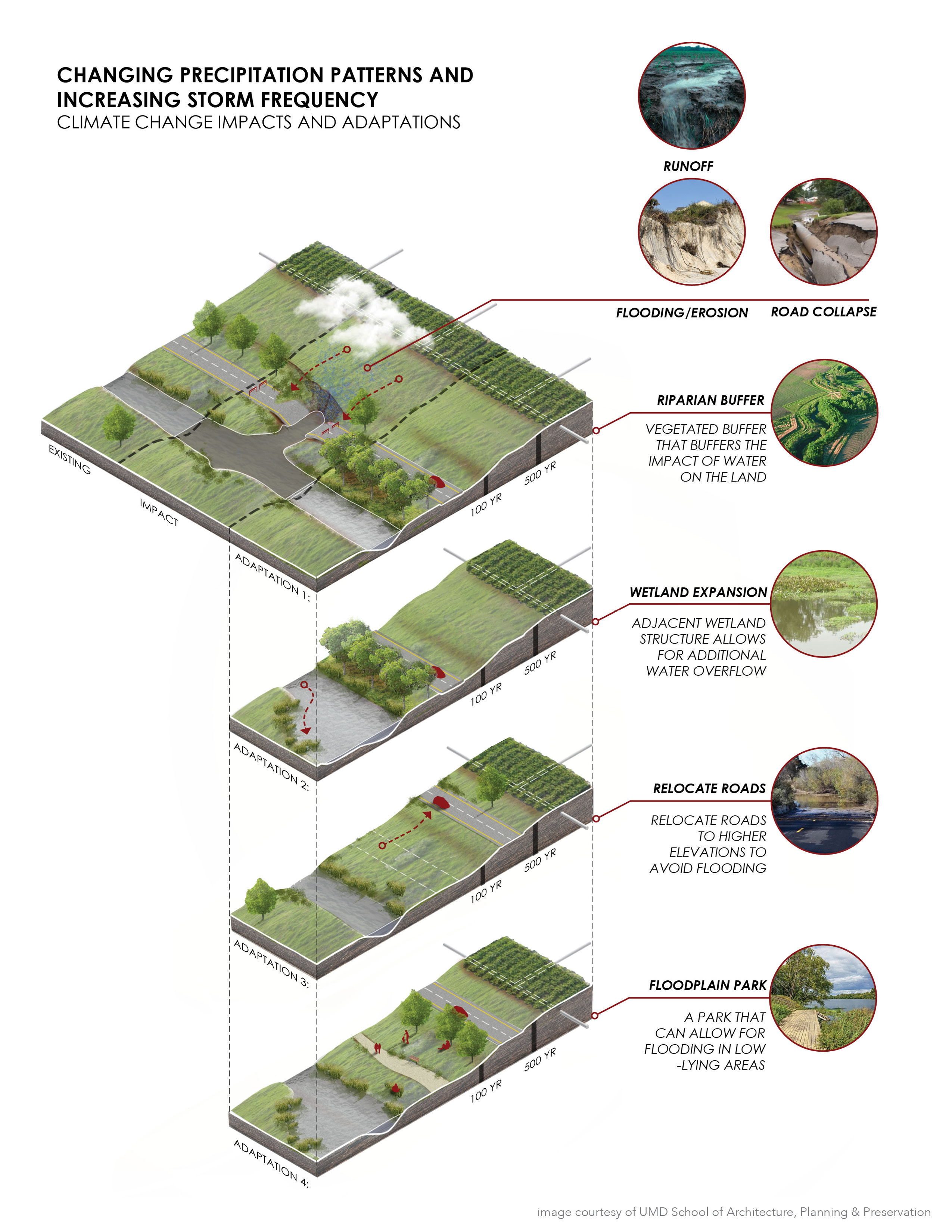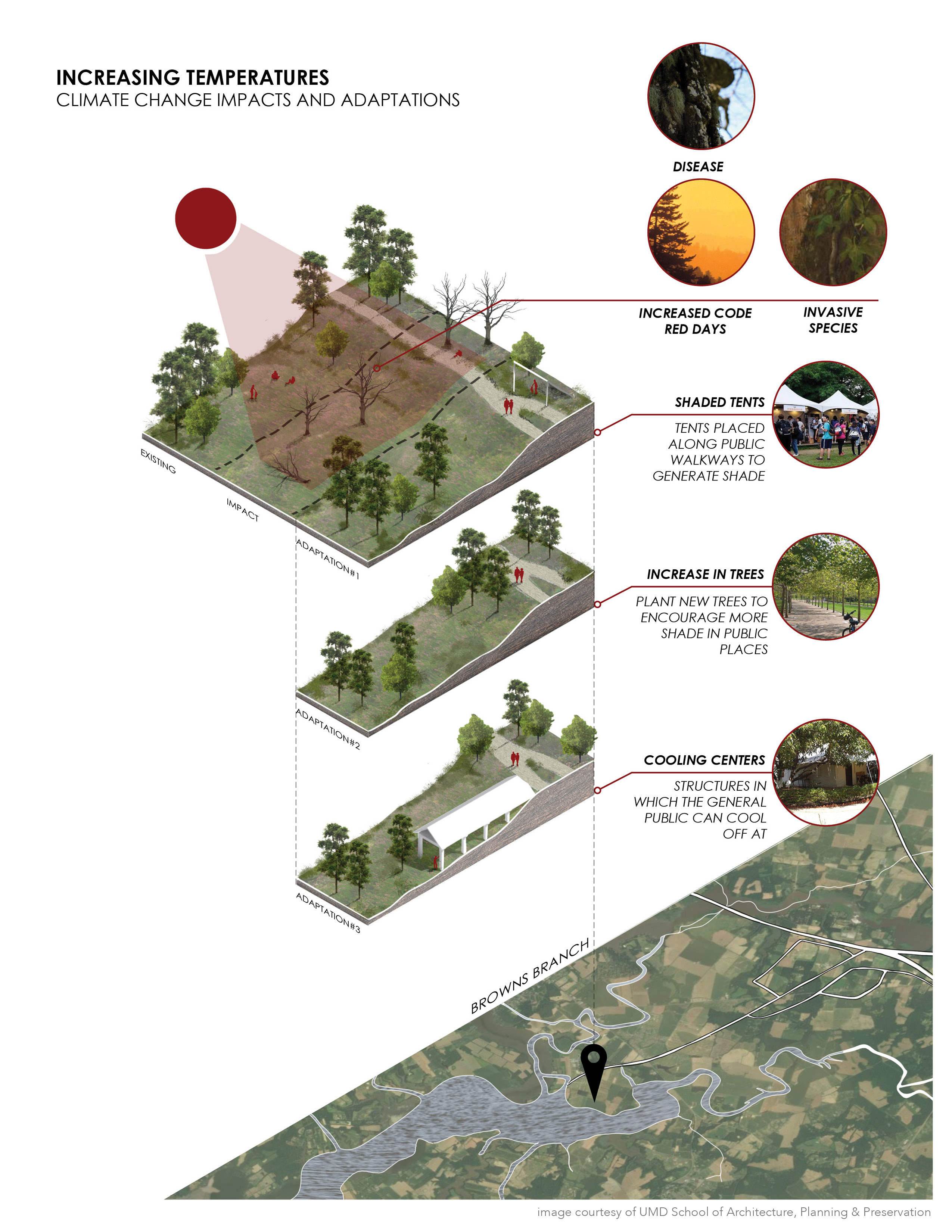 Through their work with the National Center for Smart Growth at the University of Maryland (UMD), the Maryland Department of Natural Resources (MDNR) and NOAA, U.S. Department of Commerce commissioned this final report from the University’s Partnership for Action Learning in Sustainability (PALS). PALS works with local jurisdictions throughout Maryland to identify projects and problems that can be taught through university courses where students focus on developing innovative, research-based solutions. The Climate Change Impacts and Adaptations at Maryland State Parks project concentrated on providing advanced climate change impacts and adaptation graphics. This includes an overall booklet and individual pages. If used, please provide credit to the UMD School of Architecture, Planning & Preservation.